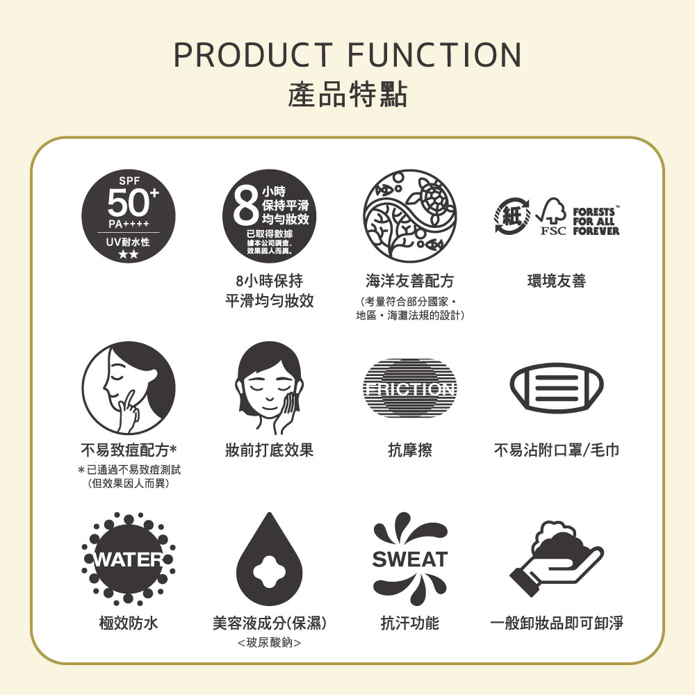 -平滑美肌塗膜設計:不易破裂的凝膠膠囊貼合肌膚凹凸處,形成飽滿塗膜。修飾痘疤與毛孔凹凸,打造平滑肌,妝感不厚重