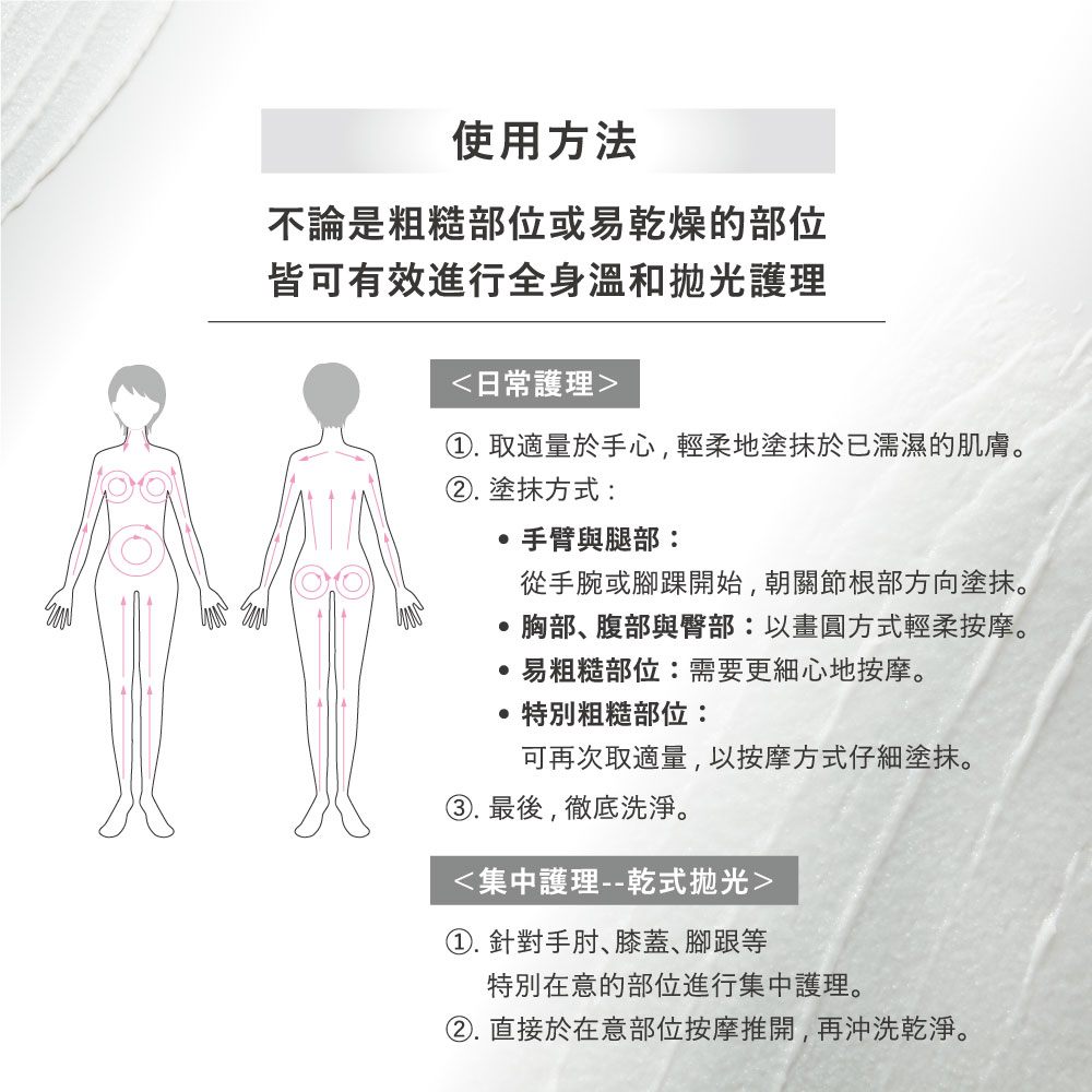 ★可「乾式拋光」針對粗糙和暗沉的手肘、膝蓋、腳跟等部位集中護理