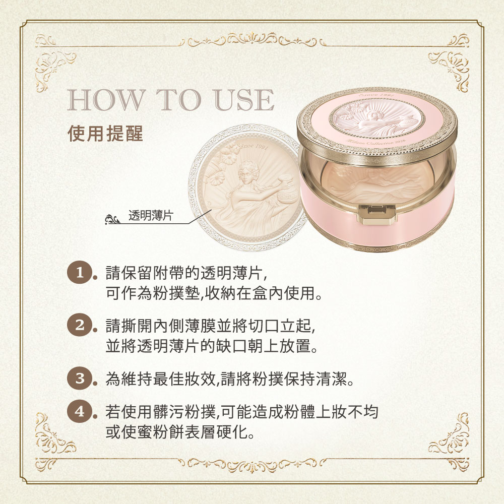 ・請保留附帶的透明薄片,可作為粉撲墊,收納在盒內使用