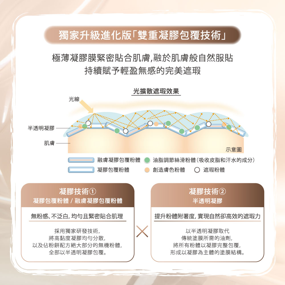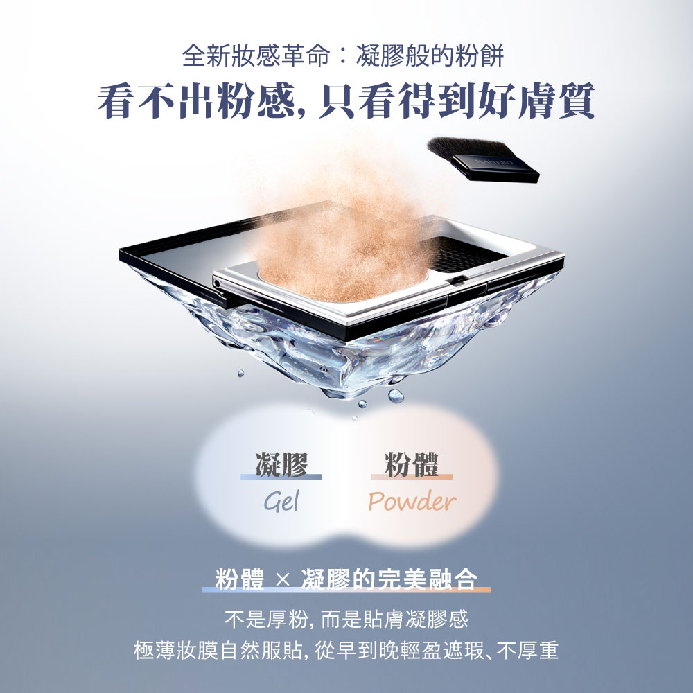 以半透明凝膠包裹大量無機粉末,減少粉感與泛白;細緻貼合肌理,妝面更平滑不顯粉